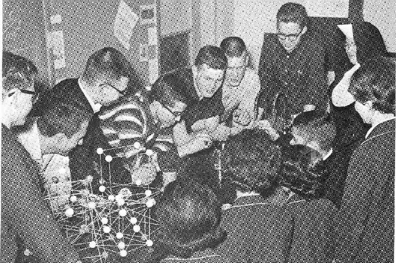 The physics class intently watches as a classmate tries to make a pin float. |