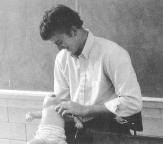 Practicing CPR on a baby dummy